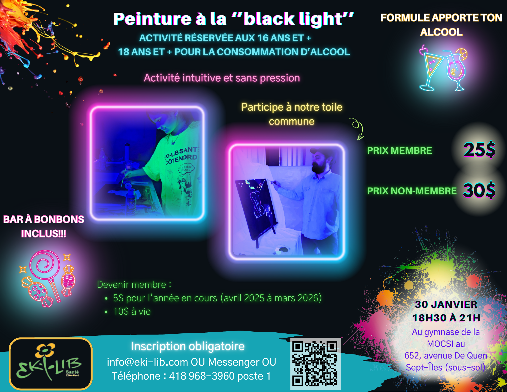 Oui, vous avez bien lu, dans le noir! Il n’y aura qu’un éclairage à la « black light » et de la peinture fluorescente pour guider vos coups de pinceaux. Sur place, un bar à bonbons à volonté sera à disposition des participants.es et il sera possible d’apporter vos propres consommations (alcoolisées ou non).